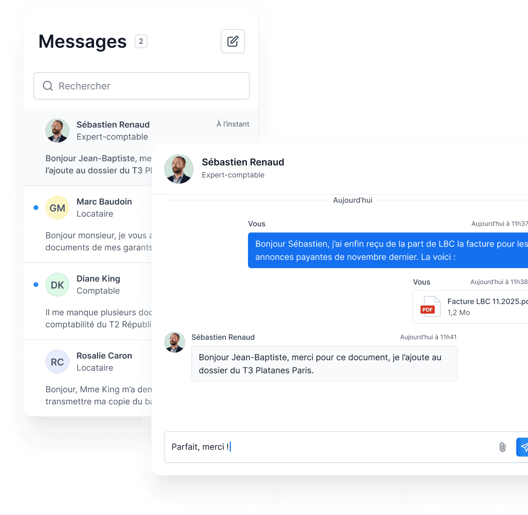 Fini les messages dispersés entre WhatsApp, e-mails et SMS ! Avec Manerty, vous bénéficiez d'une messagerie unique et centralisée pour échanger avec vos locataires et votre expert-comptable.