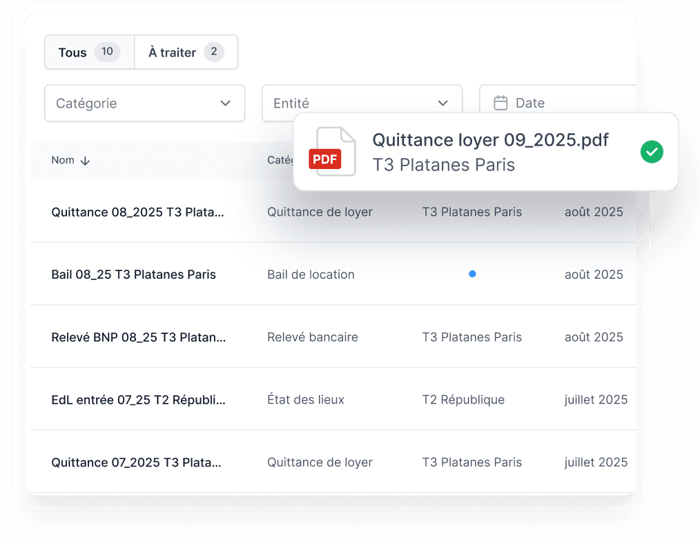 Fini le stress et la perte de temps ! Que ce soit un bail, une quittance de loyer ou un état des lieux, tout est stocké de manière sécurisée sur la plateforme. Vous y accédez quand vous voulez, où que vous soyez.